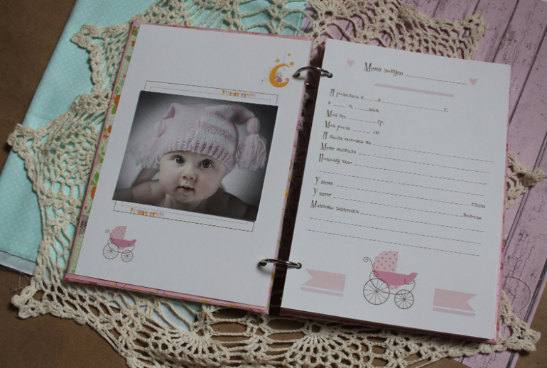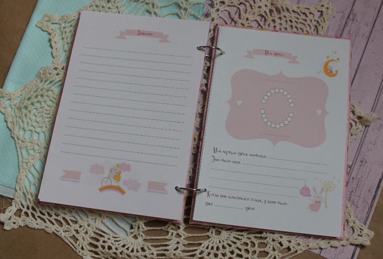 Толстенький,вмещает много -много листов для записи достижений малышки,места для фото,кармашки для всяких памятных вещей.![]()