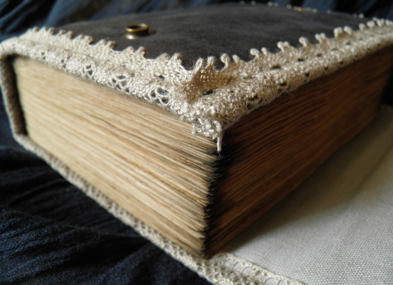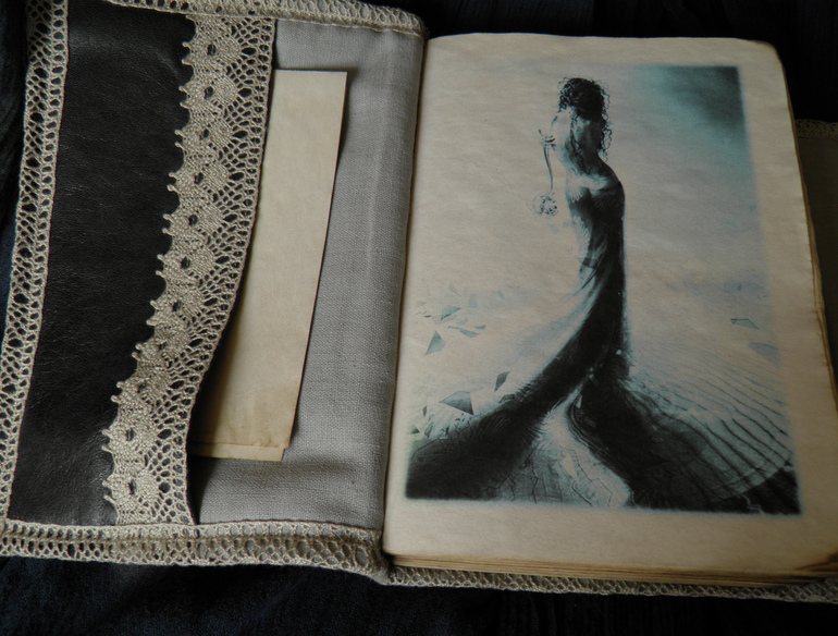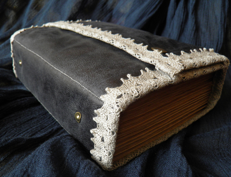 Обложка выполнена из натуральной кожи черный Пулап с льняной подкладкой. Обложка проложена тонким синтепоном для мягкости. Блокнот декорирован льняным кружевом.