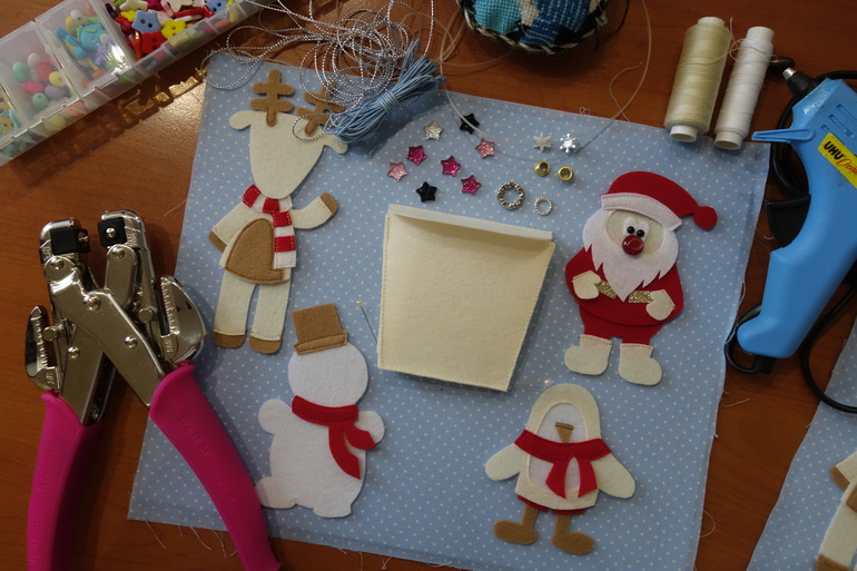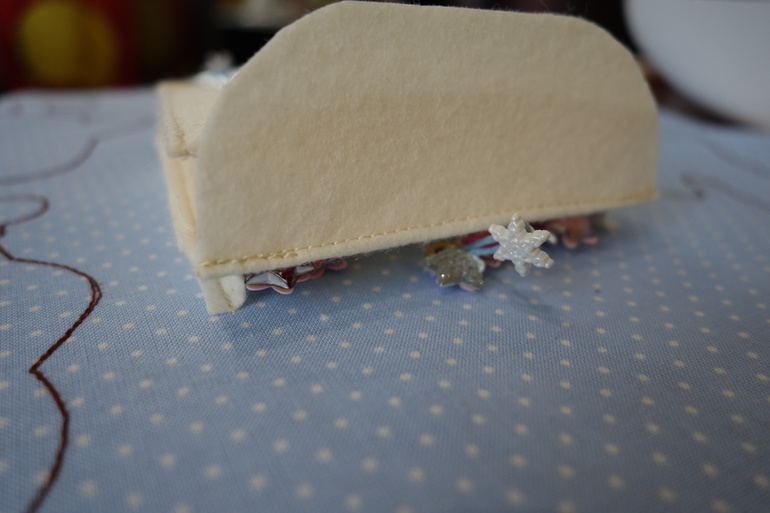Далее всю конструкцию нужно закрыть аккуратно, проверив на работоспособность до пришивания, потому что одно дело когда мы просто бусинки сажаем на клей - они мелкие и залетают в хобот без особых потерь, не сильно цепляясь за край... Другое дело-объёмные элементы, которые так и норовят за что-нибудь цепануться... Поэтому в этом проекте на коробочке у меня специальный взъём подшит, который не мешает прятаться звёздочкам:)
