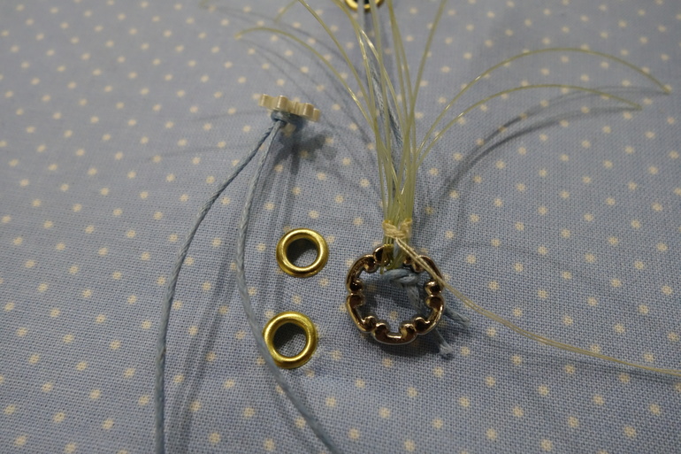 Нижний шнур точно так же креплю к колечку снизу, смотрю, чтобы колечко оказалось около 2-го люверса сверху - это другая сторона стопора конструкции. Леску нарезаю, складываю пополам, продеваю в колечко и просто зашиваю ниточками, чтобы закрепить основание.