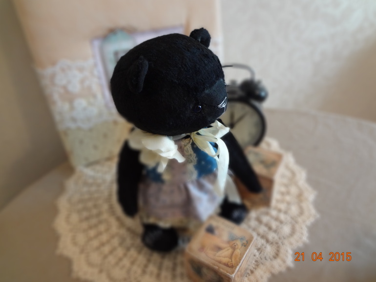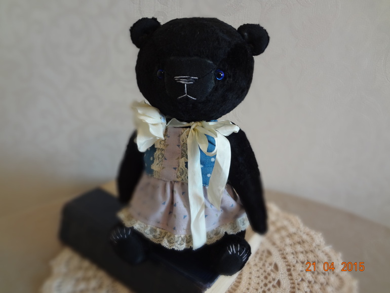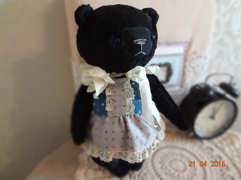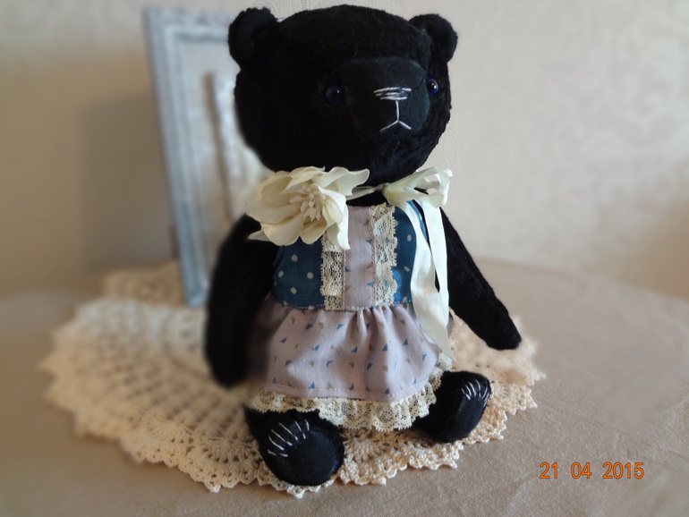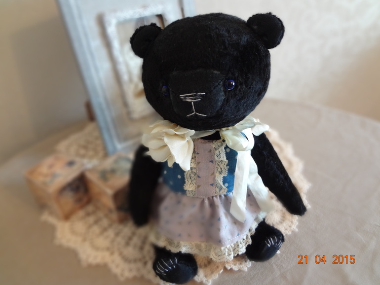 Игрушечный мир - животныеСегодня появилась еще одна выкройка по моей авторской выкройке.Сшита из винтажного плюша полностью вручную с большой любовью и теплом.Набита плотненько опилочками,утяжелена стальным гранулятом,такая тяжеленькая,приятно держать в руках. На шплинтовом креплении,голова на двойном,покачивается. Глазки стеклянные.глубокого синего цвета,от того у мишки такой задумчивый взгляд. Мишка выполнена в винтажном стиле.Платье съемное,тонировано. Украшена мишутка брошью в виде цветка.