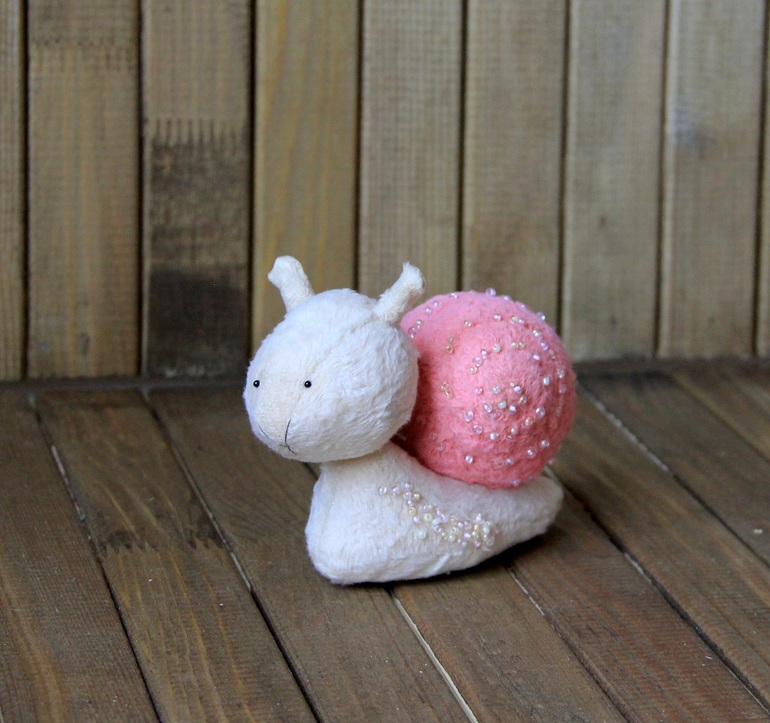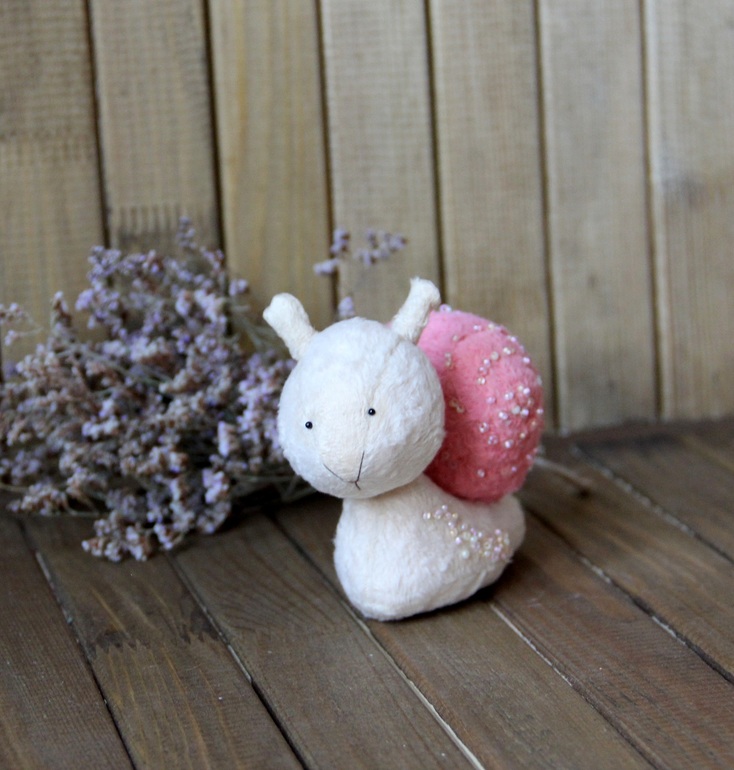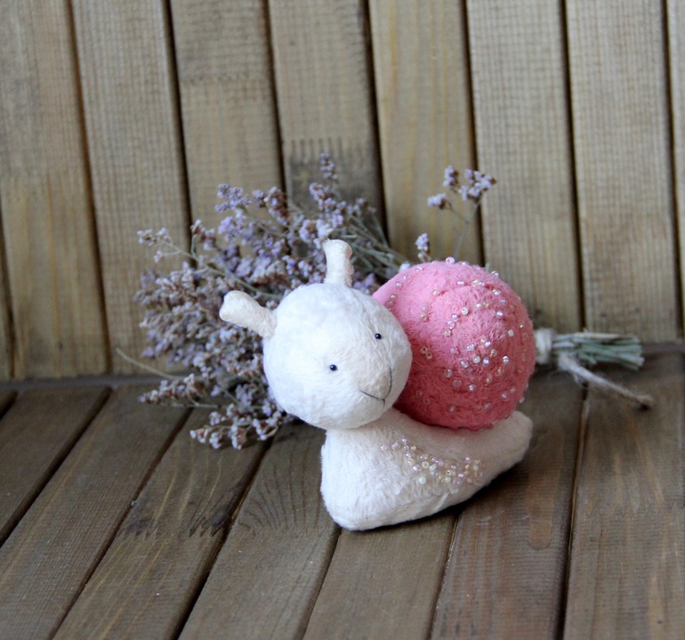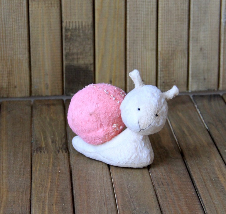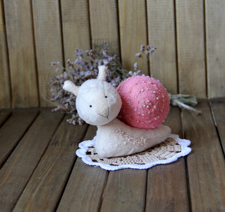 А моя улитка ползет (стоит то бишь) самостоятельно, ракушка украшена стеклянным бисером 3х цветов. Длина животинки 10см, "высота в холке" 8 см. Вискоза, опилки, стеклянные глазки.