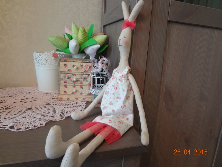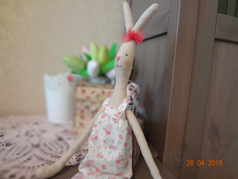 Игрушечный мир - животныеСшила еще одну зайку в стиле фирмы Майлег. На этот раз рост у зайки вместе с ушами 48см,такая вот худенькая и высокая девочка. Одета зайка в сарафанчик из хлопка,можно снимать и менять наряды. Не знала как сфотографировать,вот как-то так получилось...