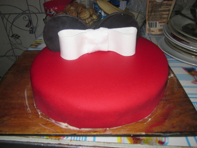 Торт получился совсем не такой, как я хотела. Мастикой обтягивала первый раз - получилось на ура, ни единой складочки, если бы знала что так хорошо обтянется, то еще бы ровняла и ровняла, ушки и бант ставил муж, все это делалось на кухне на скорую руку, поэтому фото ну совсем не ахти, но другого нет, а еще были орешки со сгущенкой, но они в кадр не попали.