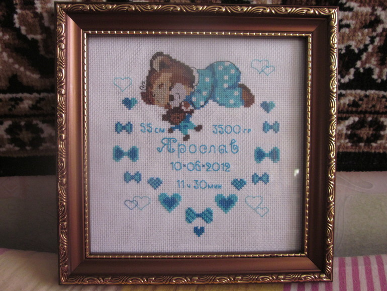 удивительных вязаных слоников слоников. И решили мы обменяться. Я вышила метрику Все под катом....