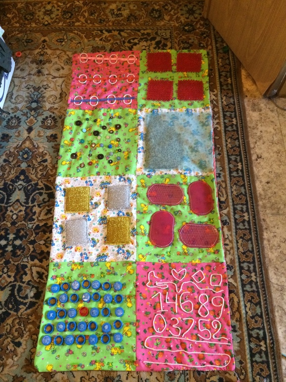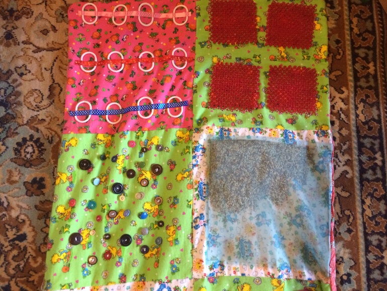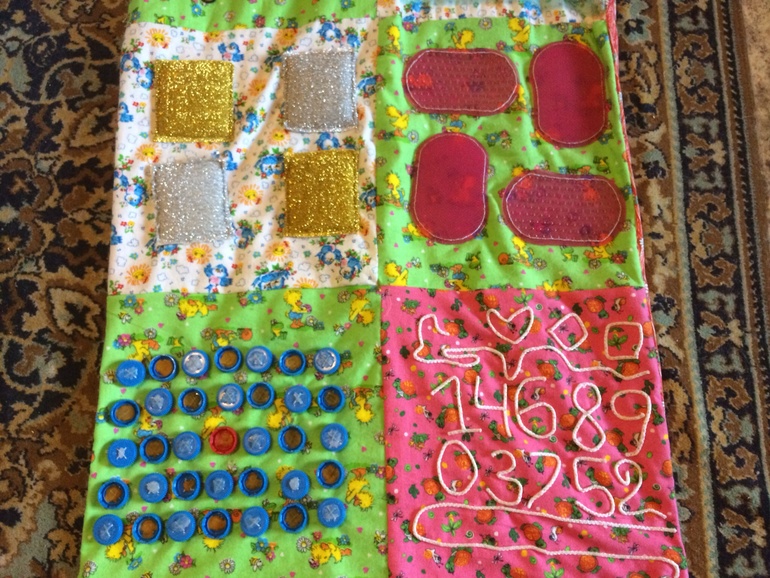 Тут колечки от штор, квадраты это части коврика для ног, знаете такой бывает для обуви колючий, пуговки, гречка с перловкой под сеткой, белое с золотым это губки для посуды, рядом с ними розовые мочалки жесткие с пупырышками, потом крышечки и капроновая веревку, пришивала циферками, чтобы ножкам были разные ощущения