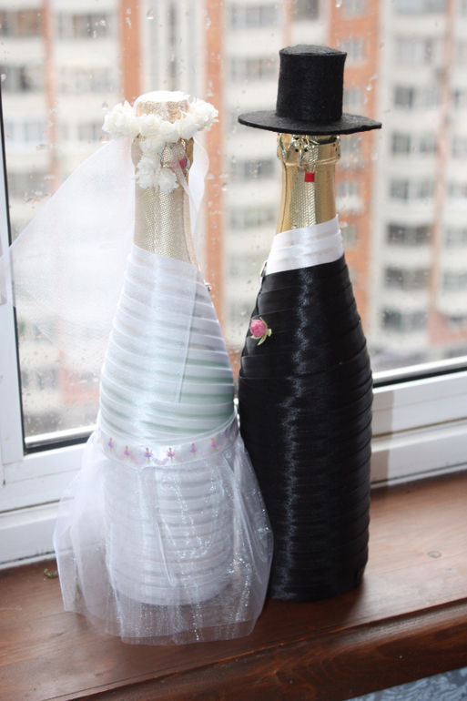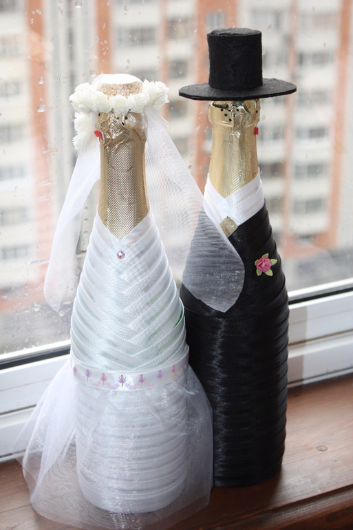 Мария, здравствуйте! Понравились Ваши молодожёны. Я так поняла бутылки обклеены косой бейкой. А сколько бейки на одну бутылочку? Спасибо!