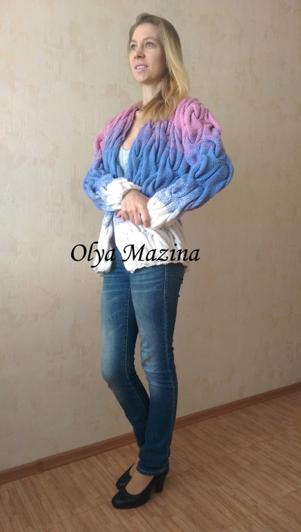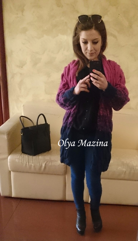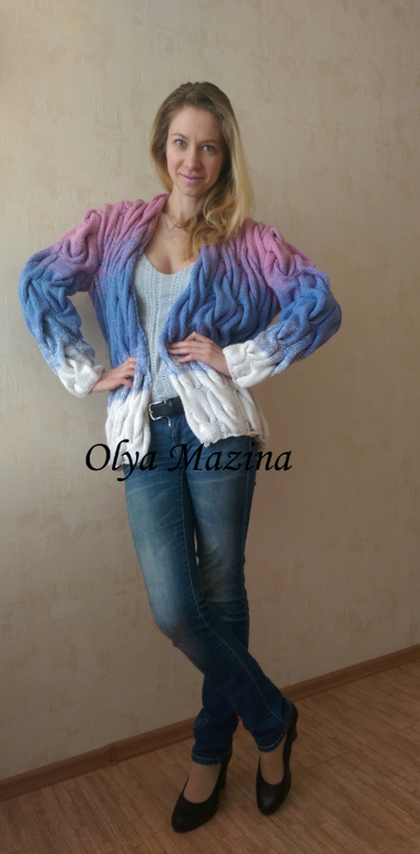 очень аккуратные и красивые работы! молодец! а как вы стачиваете детали? и что за пряжа в синем кардигане использовалась?