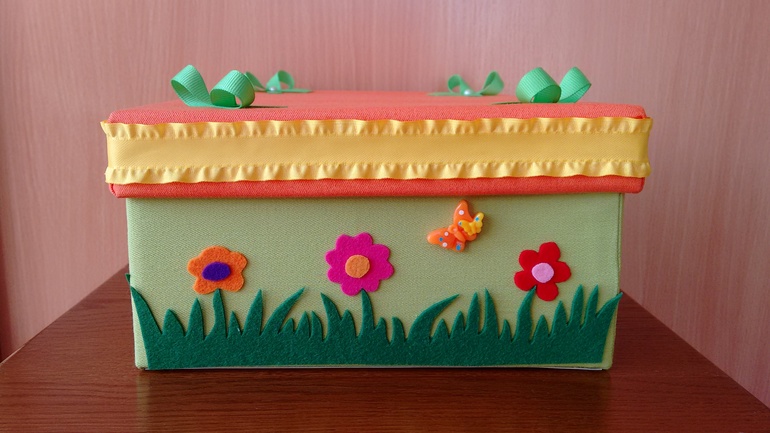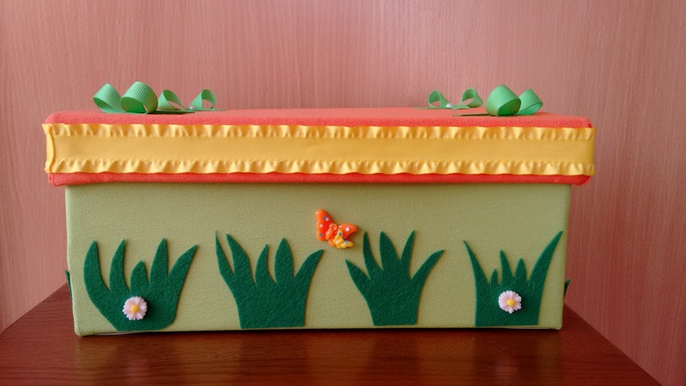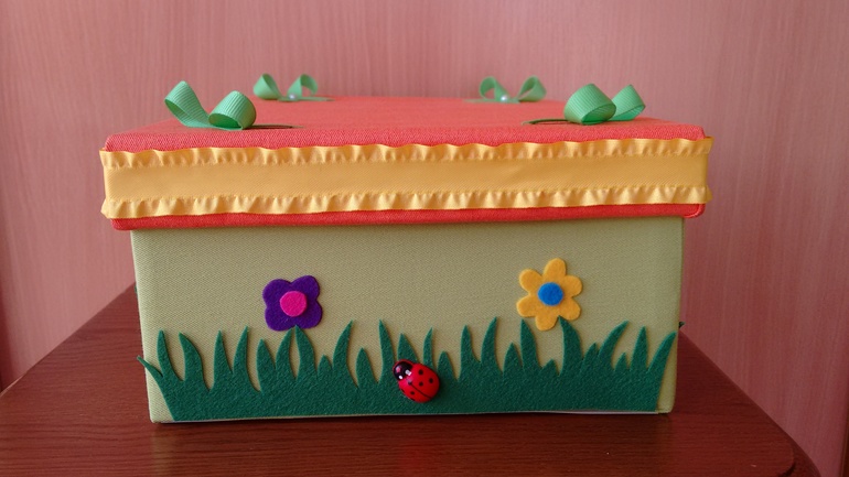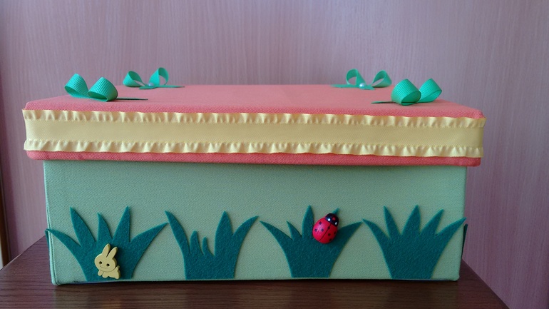 Дали нам в садике задание сделать коробочку в творческий уголок... Со слов воспитателя, просто любую коробку от обуви обтянуть тканью, бантик какой-нибудь навесить и хватит... В эту коробочку детки будут складывать карандаши, ножнички и прочее...