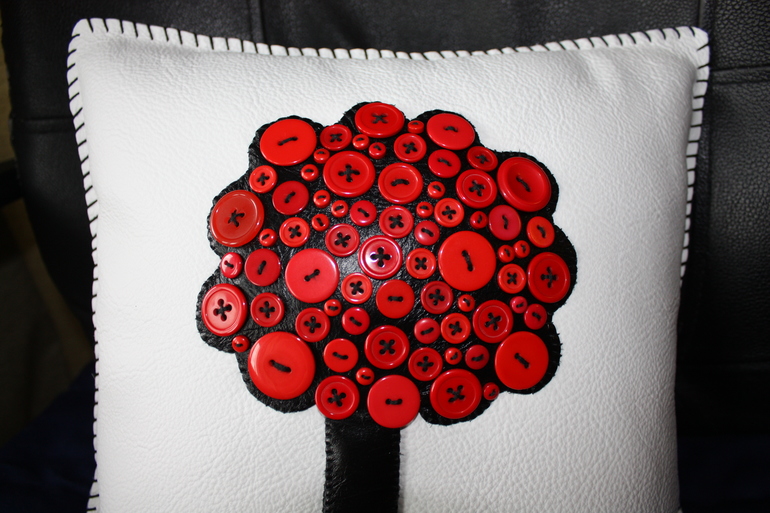 Уже доделываю для сестры такую же подушку, но с бирюзовыми пуговицами. Очень сочно получилась бирюза на черной коже.. Потом выложу фото )))