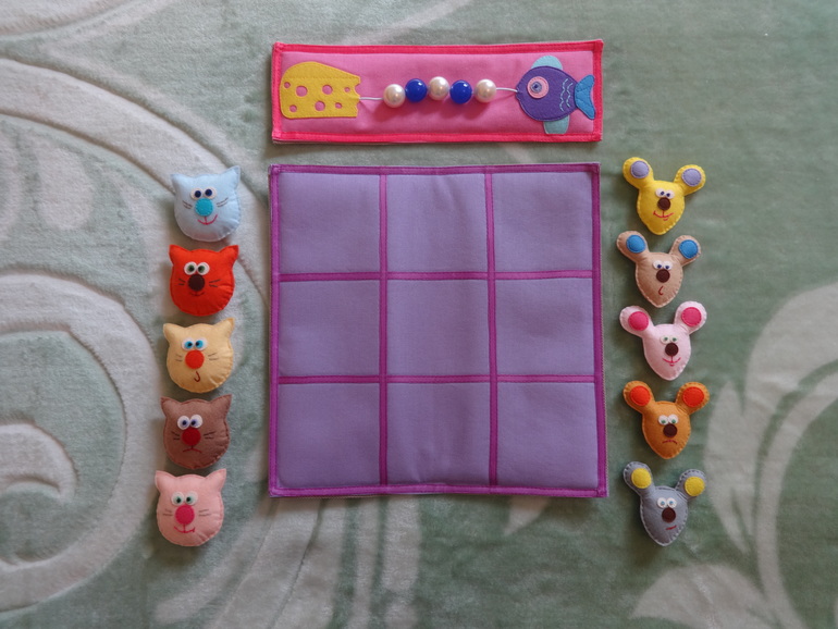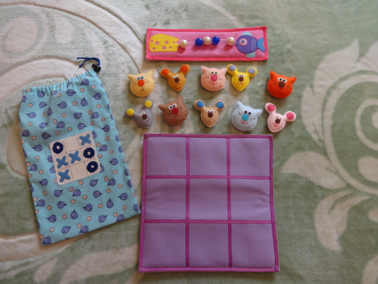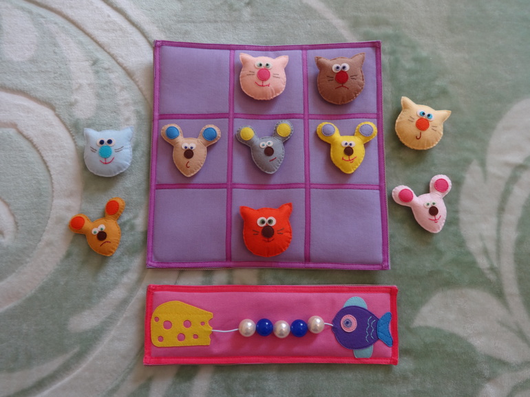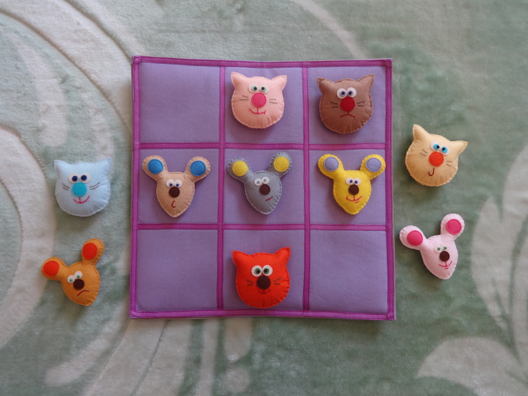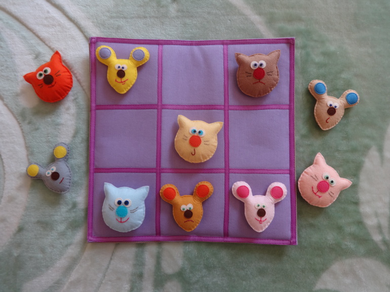Развивающие игрушкиМоя последняя работа с любимым фетром от Светланы. Разрекламирую её напоследок)) Фетр правда классный, я с ним дружила 2 года, причём с одним набором, всё-всё-всё из него делала. Такой большой набор оказался, очень выгодно, а качество не описать словами, как приятно и легко с ним работать! Итак, игра крестики-нолики или кошки-мышки. Ждала идея своего часа, вот дождалась