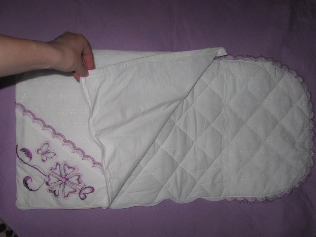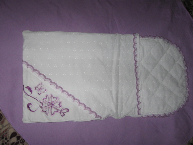 Делюсь своей идеей с рукодельными будущими мамочками, которым предстоит рожать этим летом. Материал: х/б шитье, задняя, простеганная сторона на синтепоне, внутренняя сторона простой белый ситец, окантовка готовая продается. Вышивку делала гладью, шелковыми нитками на ситце белого цвета и потом уголком пристрачивала. К конвертику покупала лиловую пеленку, комбез и шапочку, затратила где-то 1500 рублей на все про все.