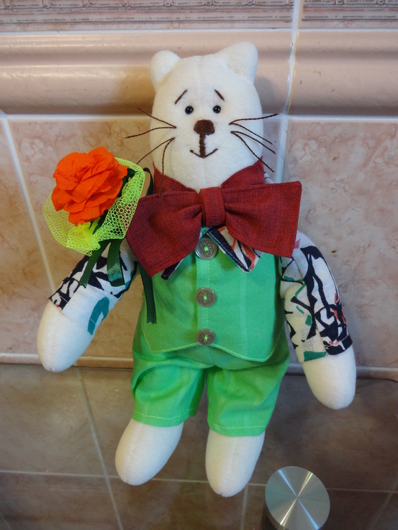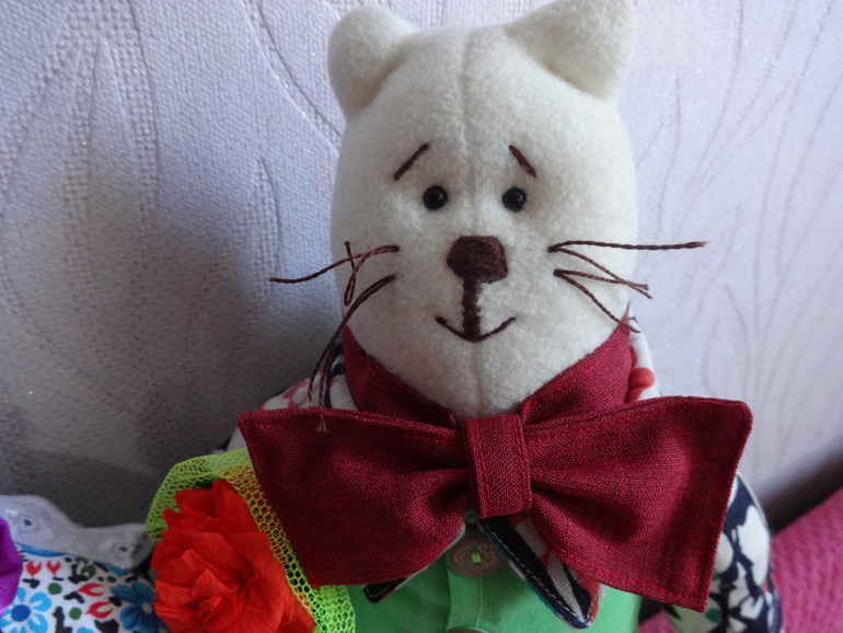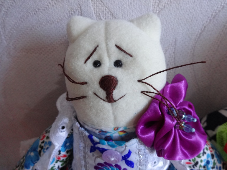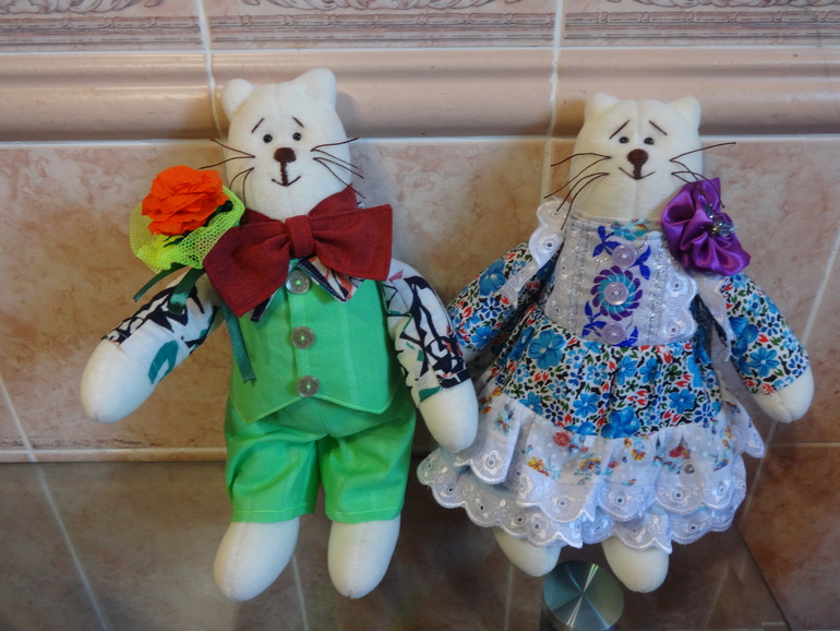Игрушечный мир - животныеПошились вот такие Котофейкины, Василий и Василиса. Из флиса, ростом около 32 см котик и около 30 см кошечка. Стоят и сидят с опорой, ручки и ножки на пуговичном креплении. Одежки - хлопок, атласная лента, габардин, шитье. Фотосессия не совсем удачная, кошечка на фото толстенькая, в реальности поизящней.
