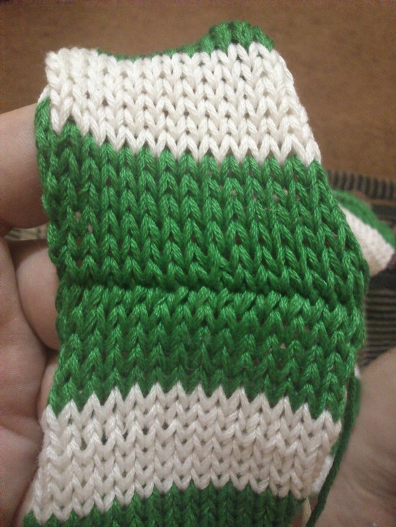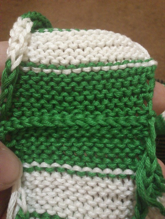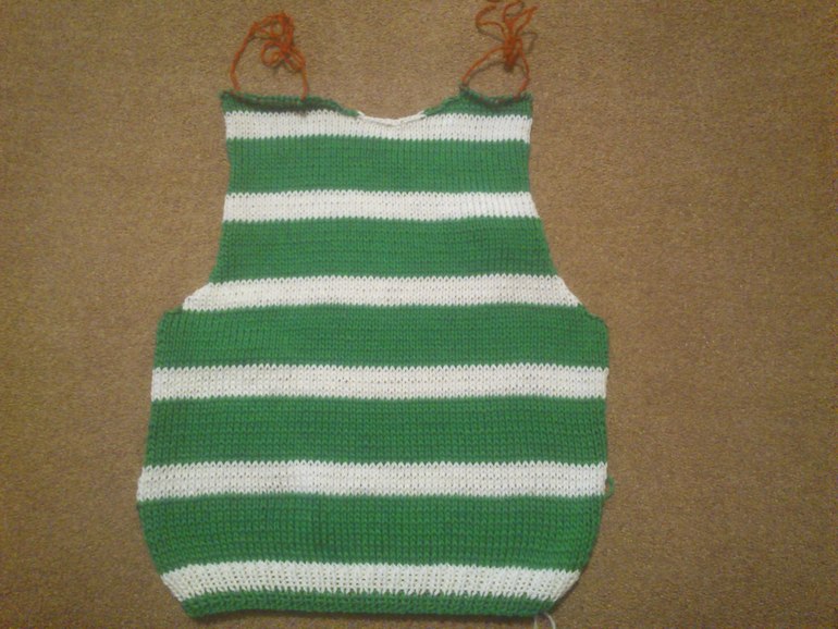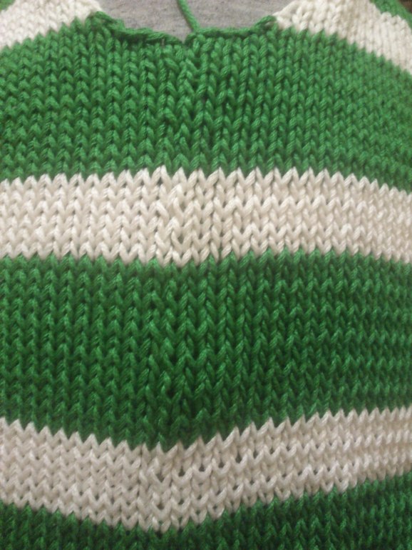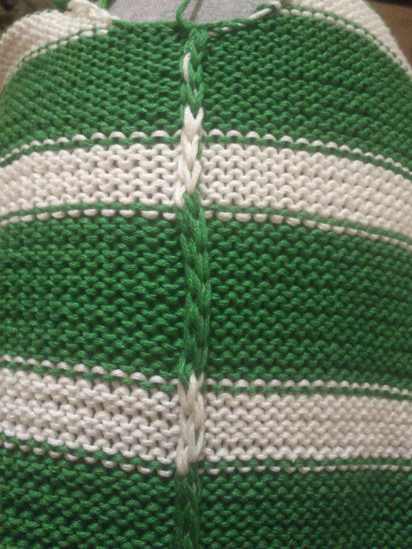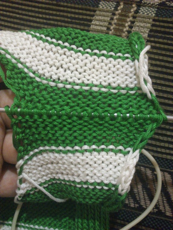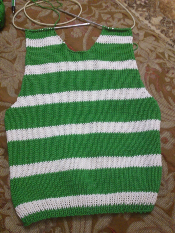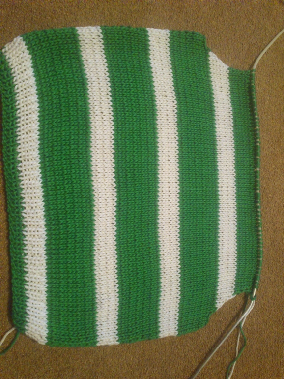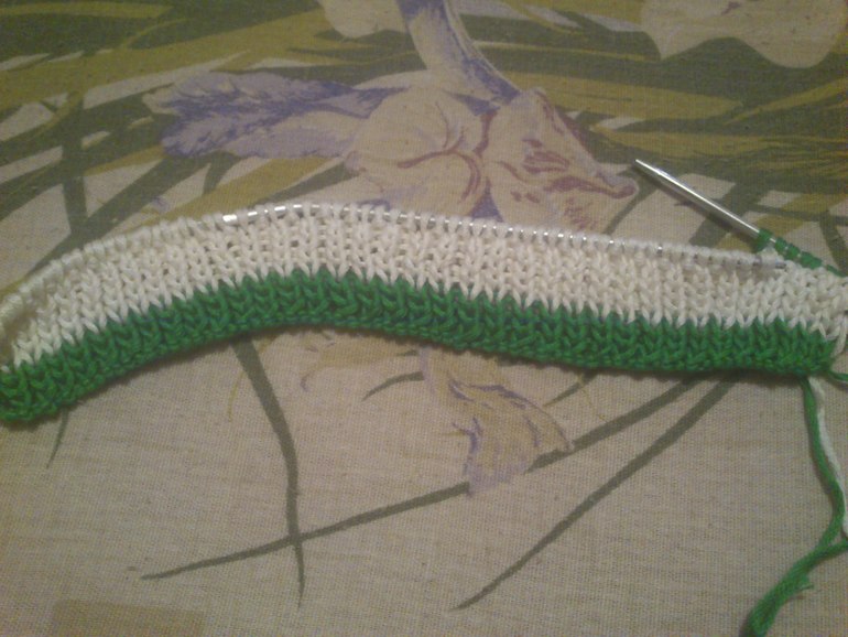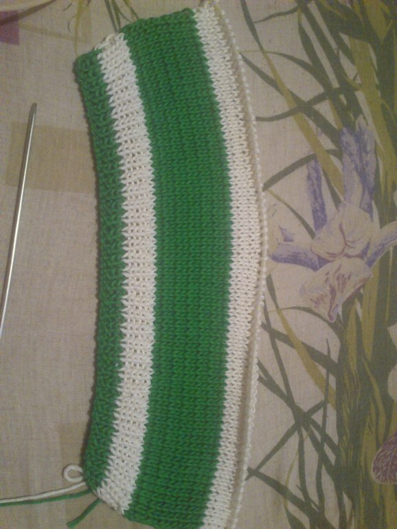 Далее переходим на лицевую гладь, вяжем зеленой нитью 12 рядов, затем белой нитью 6 рядов и т.д., вяжем 19 см (до проймы).