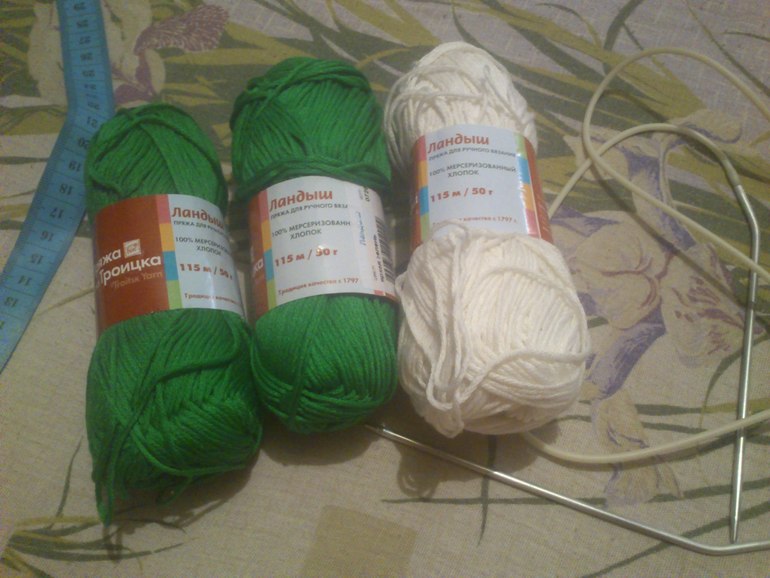 Вязать буду безрукавку для сынишки). Ниточки у меня Троицкой камвольной фабрики Ландыш, 100% мерсеризованный хлопок, 115м/50г, 2 моточка "Яркая зелень" и 1 моточек "Отбелка"