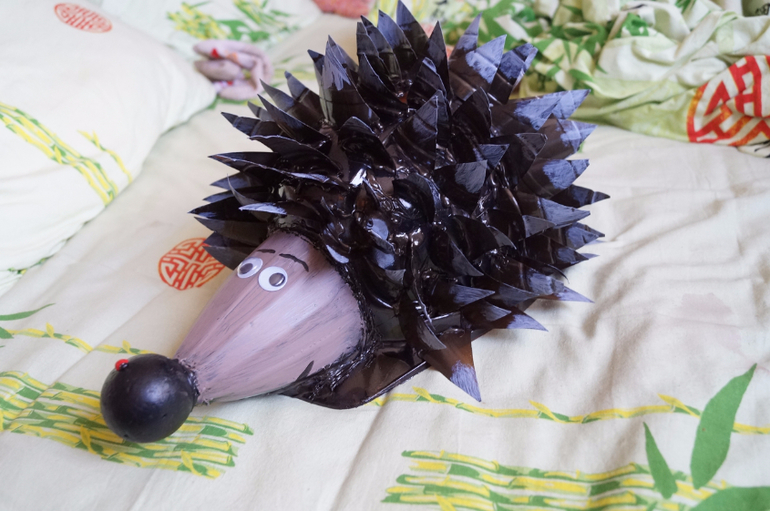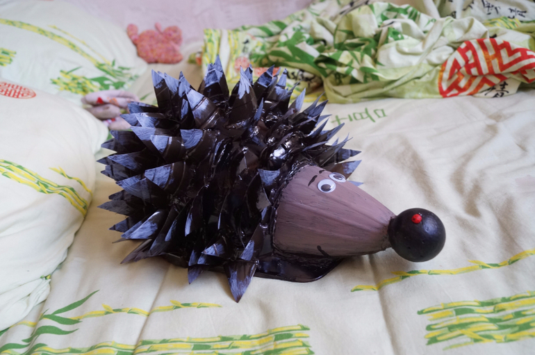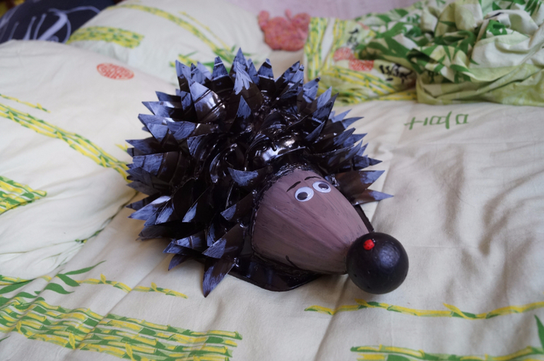 Спасибо) для детей же стараемся, что бы им интереснее было)Ёж из строительной каски и пластиковых бутылок, краска из балончика и пенопластовый нос.