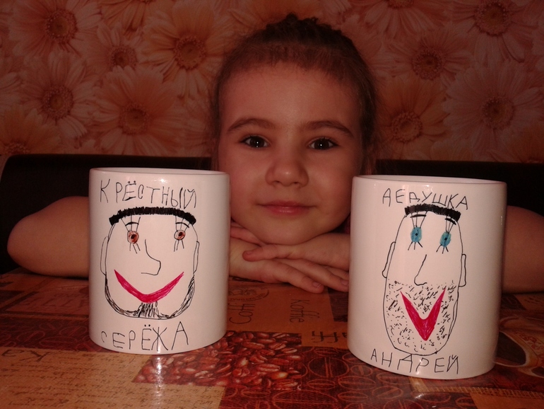 Такие подарки у нас получили все мужчины на 23 февраля и все женщины на 8 марта. Даша нарисовала всех бабушке и дедушке, а потом мы это все на кружки в фото магазине перенесли. Вот только папе был индивидуальный подарок. Его выложу позже. Как и все остальные кружки.