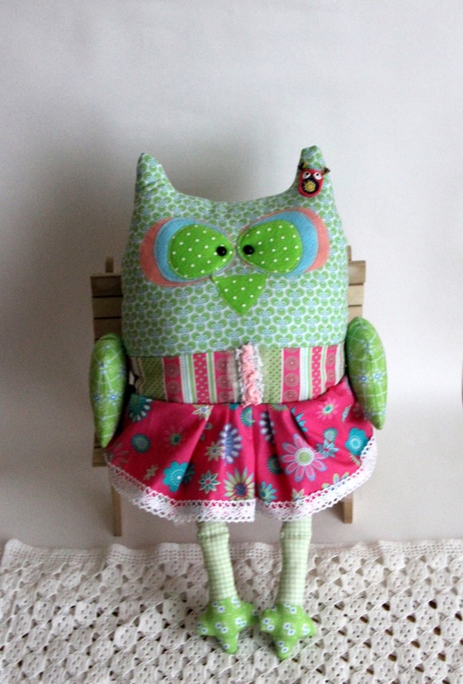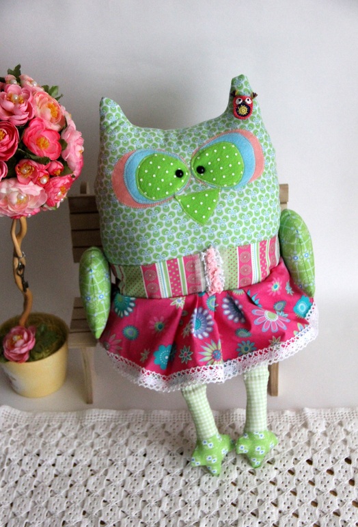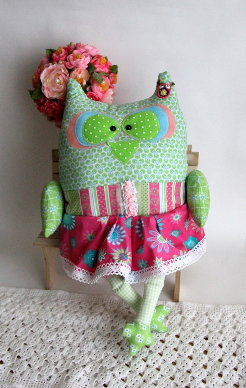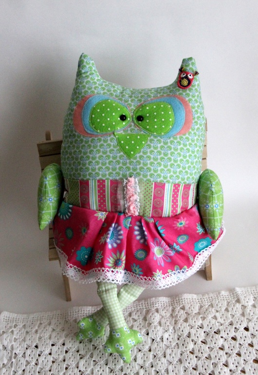 Совушка из хлопка ярких цветов, ростом 50 см. Друг-подушка, наверное. Подъюбник из фатина, стеклянно-фетровые глазки, немного кружева.