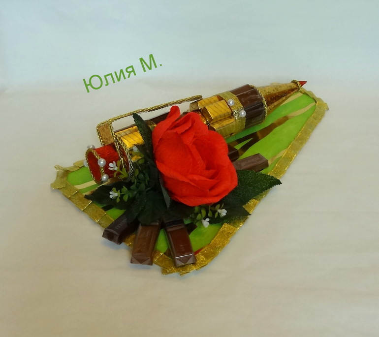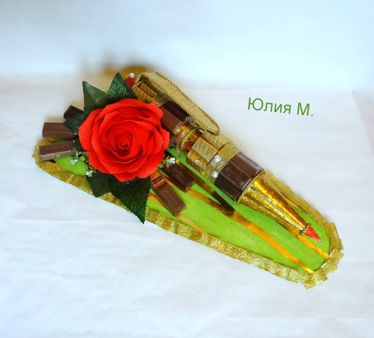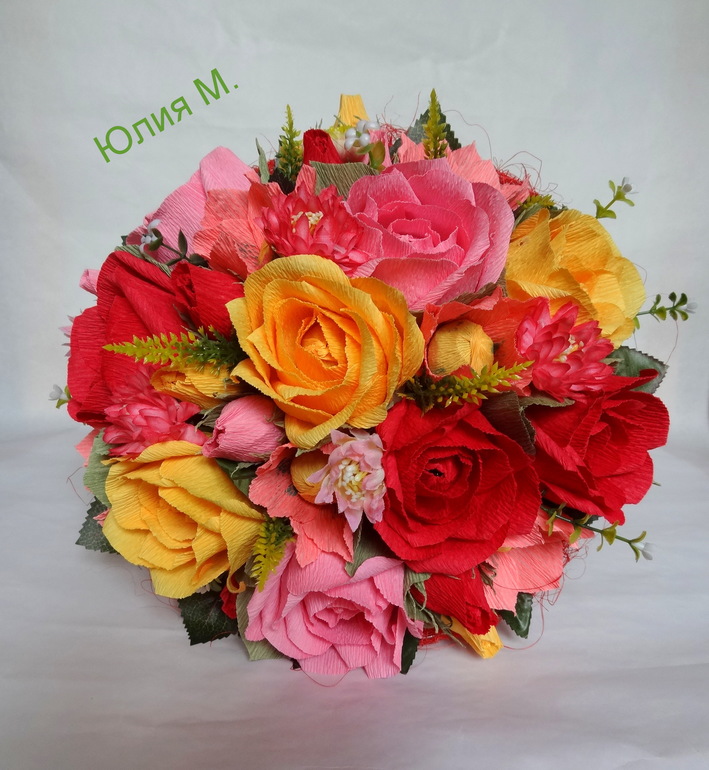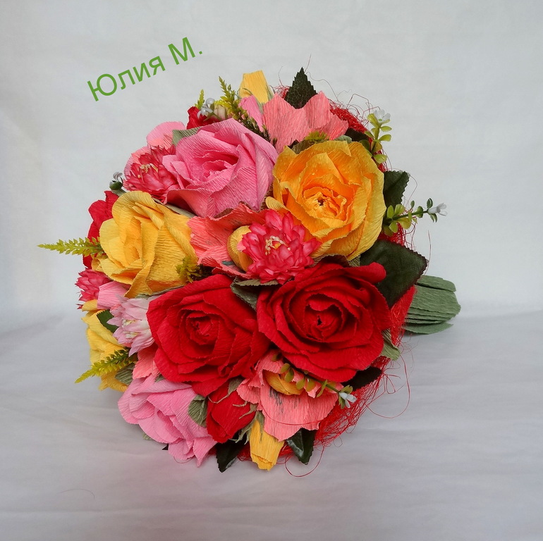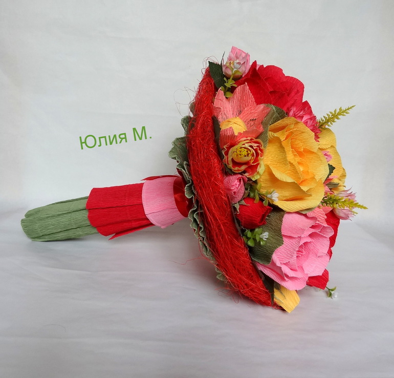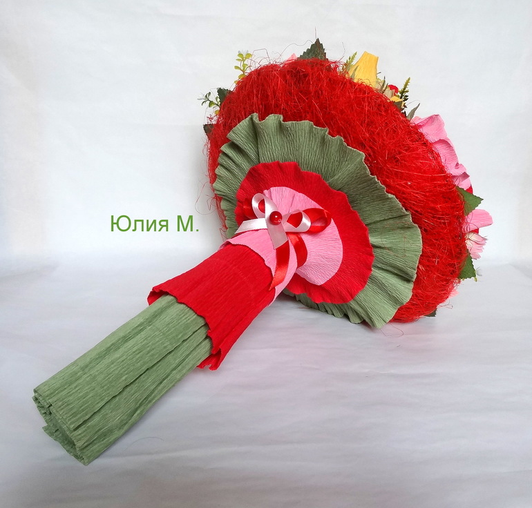 я можно немного критики внесу....может я и не права. Букет очень красивый, а вот ручка....сама идея классная, но золотой ободок мне напоминает траурный похоронный венок....может как то форму поменять или цвета....простите если обидела.....