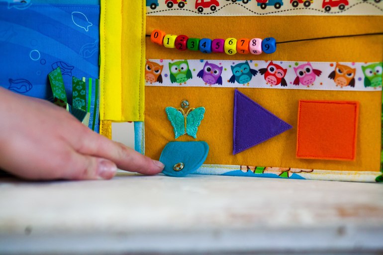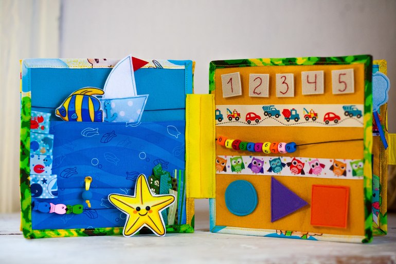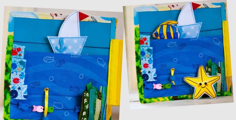 Развитие мелкой моторики. Рыбки и кораблик движутся по шнуру. Рыбка-перетяжка прячется в кармашке. С морской звездой можно играть отдельно.