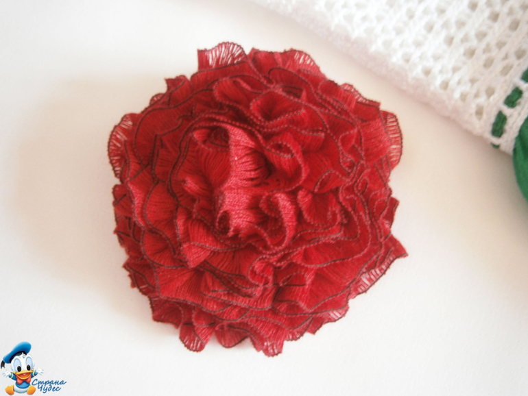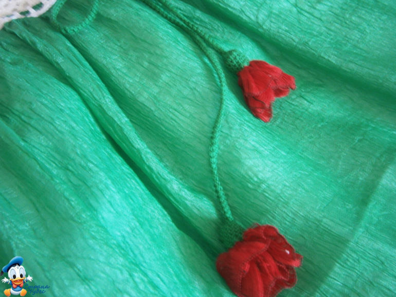 Линию талии подчеркивает контрастный шнур, концы которого украшают бутоны еле распустившихся розочек.