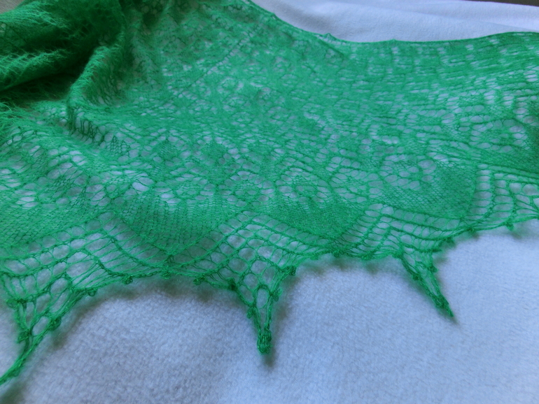 Форма треугольная, по моим меркам огромная - по центральной петле 110 см, по верхнему краю 190 см. При этом по прежнему невесомая - 55 граммов итальянского мохера Igea Astro. Цвет весенней зелени очень нежный, но насыщенный.