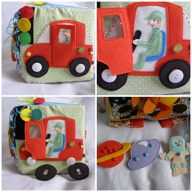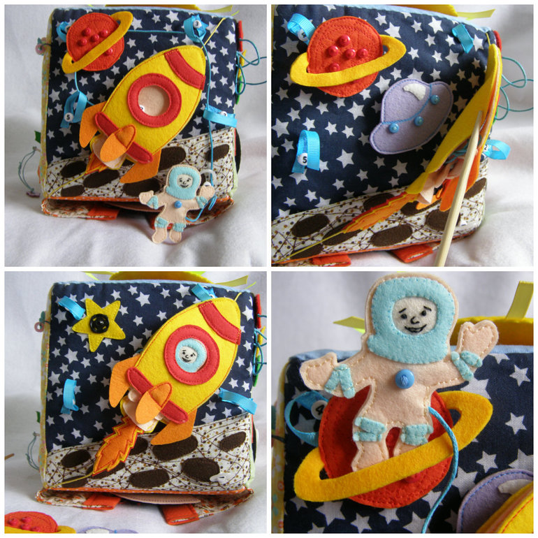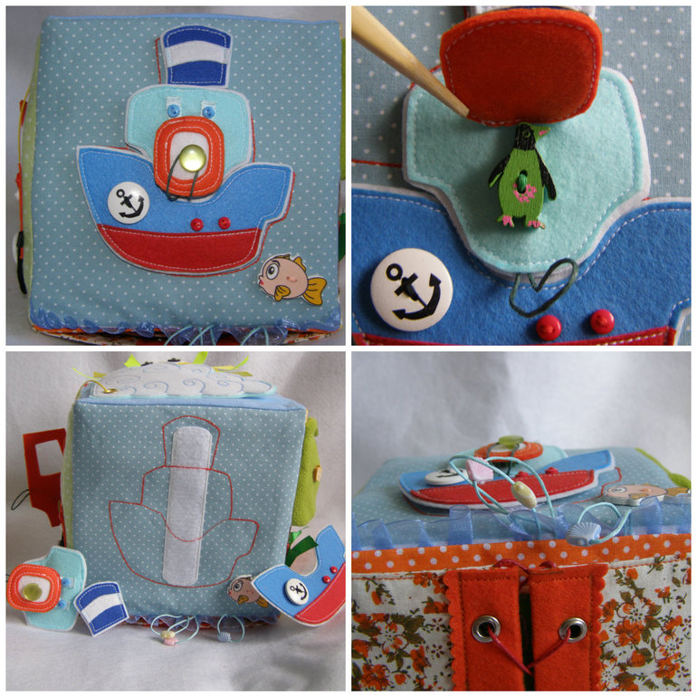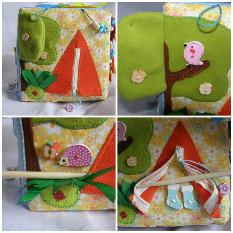 Вот такой развивающий кубик сшила в подарок. Идеи взяты все из интернета из всевозможных источников, всех и не упомню.