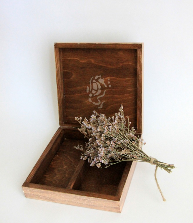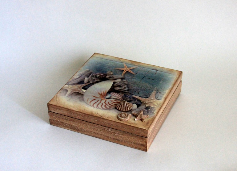 Шкатулка для купюр размером 18*18 см, внутри покрыта морилкой, набит морской узор