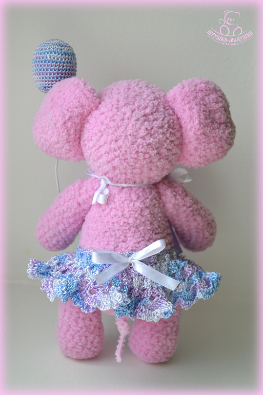Одета малышка в юбочку, связанную прижей Тулип, пояском служит атласная ленточка, на шее у слоняши бантик из атласных ленточек и камушка в виде сердечка))