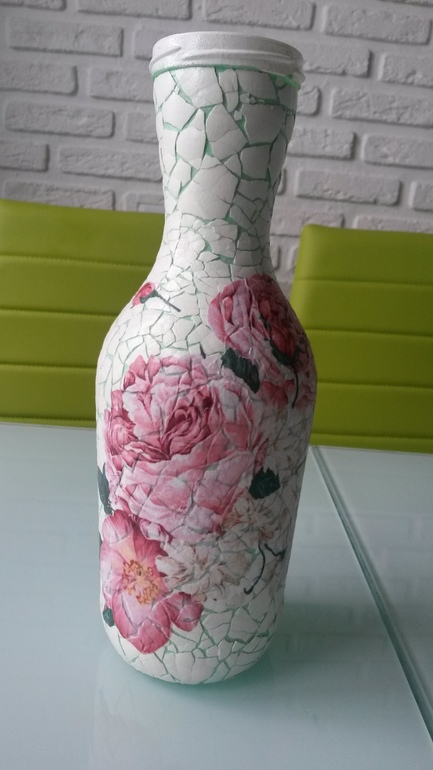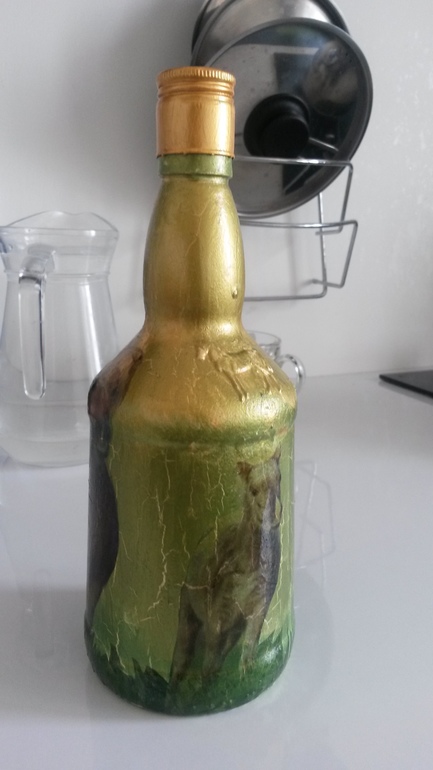 Поделки с детками.Мой юный художник не может остановиться. В интернете в основном декупаж бутылок описан. Глядя на это мой сын решил что нам тоже непременно нужны бутылки..... пустые. А еще он прочел про кракелюр.... в итоге мы опробовали две методики: одношаговый крак лаком и яйца))))). Старался перемазался клеем лаком и краской....но неделю работал не покладая кисти