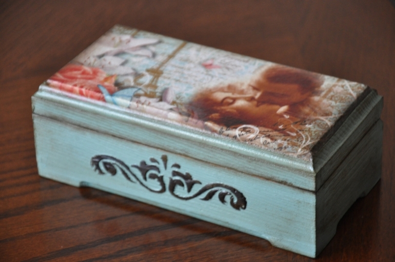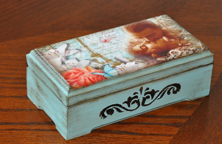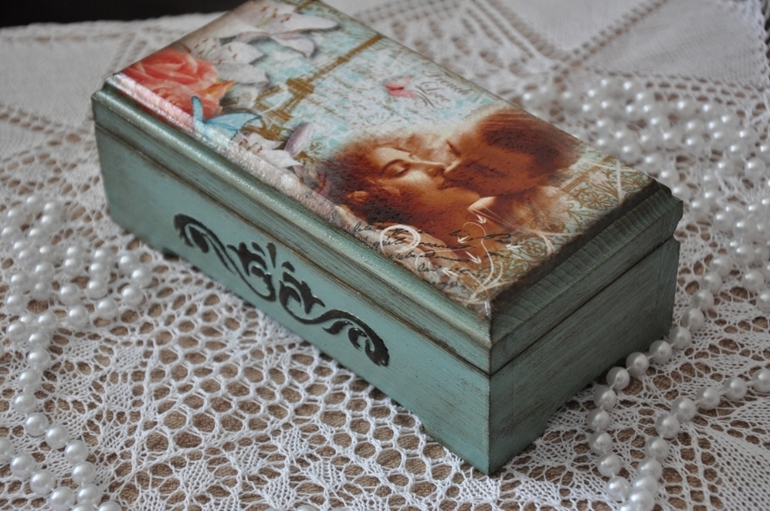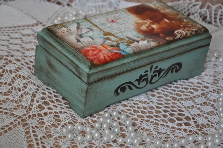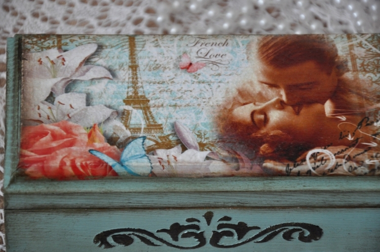 Очень красиво!! Нежный цвет, деликатные потертости. Вот рисунок трафаретом на мой взгляд лучше смотрелся бы коричневым (умбра натуральная), в рисунке больше этого цвета.