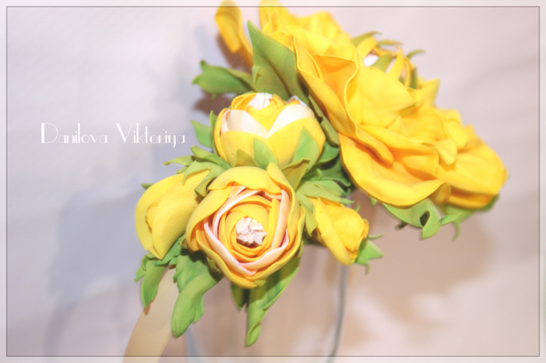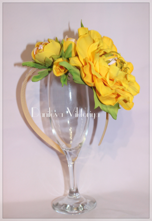 Сегодня ночью уже сделала первый заказ- нужен был ободок с желтыми цветами-задача выполнена, впереди еще заказик, но на этом не остановилась и сделала еще ободочек на продажу. Не могу остановится, нужно больше фома накупить. вчера уже накупила фурнитуры кучу.