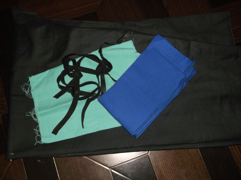 Бязь: черная, цвет морской волны и индиго - маленькие кусочки. Черная ленточка - нат. кожа.