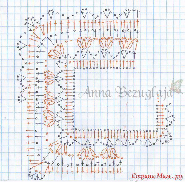 итак:15 см*4 = 60 см19пт = 5,5 см? = 60смПолучаем 207 пт /6 пт рап = 34,5 /4 стороны = 8,5 рапорта (если делаем все стороны по ровну. то предлагаю сократить до 8 рапортов в кадом, если плечи подлинне — то плечи по 9 рап, а перед и спинка по 8 — разница будет всего по 1 см думаю не критично). 8 рап. * 6 пт*4 стороны + 4 пт угловые = 196 пт. — для набораКаждая сторона будет из 196/4 = 49пт.Если делаем разрез спереди, то одну сторону еще делим пополам = 25пт + 24 +1 (чтобы кромочная получилась) птИтак наборный край выглядит так: 25 пт (половинка переда), 49 пт (1-е плечо), 49 пт. (спинка), 49 пт. (правое плечо), 25 пт (2-я половинка переда).Вяжите по схеме квадрата — в уголках внимательнее, в какие петельки вязать — там как раз идут эти +4 пт