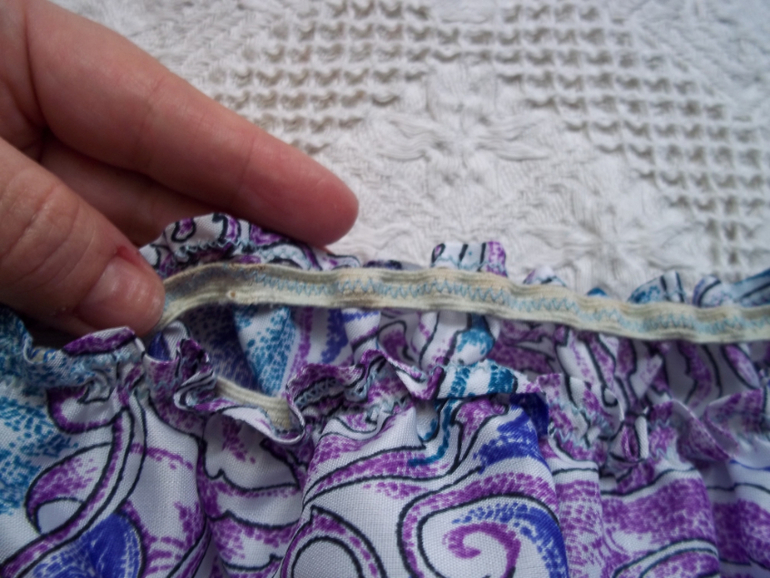 Проводим на ткани горизонтальную линию на высоте 15 см от верхнего края изделия и встрачиваем резинку.