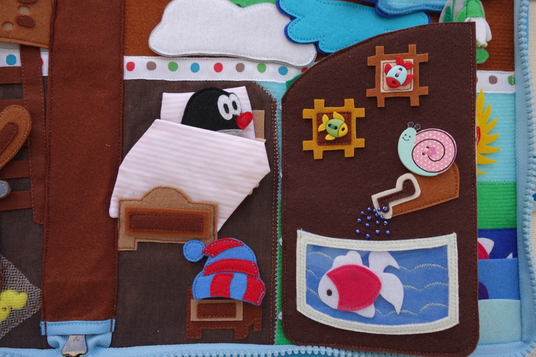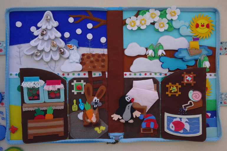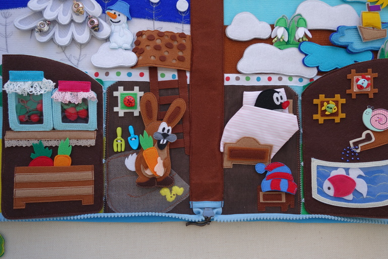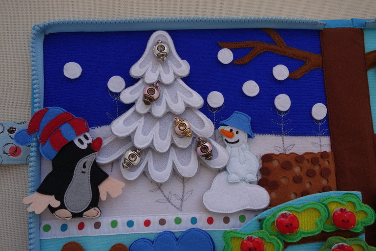 Зима. Елочка как пирамидка собирается, шарики все на липучках. Снеговик тазик-шапулю может снять, кротик тоже принарядился.