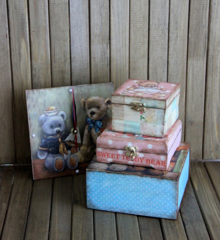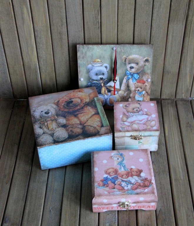 ДекупажДля Евгении, любящей шить Тедди и их друзей, получился винтажный набор с мишечками. Две шкатулки, короб, часики - использована рисовая бумага и медиум антик.