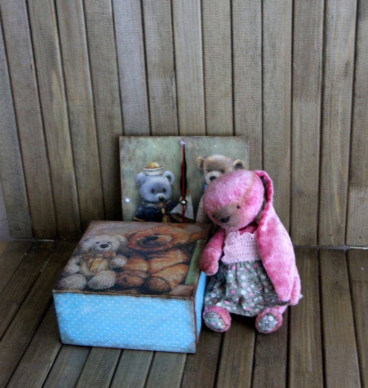 Надеюсь, ее теддики в стиле винтаж и тортюр будут хорошо себя чувствовать в окружении этих декупажных вещиц.