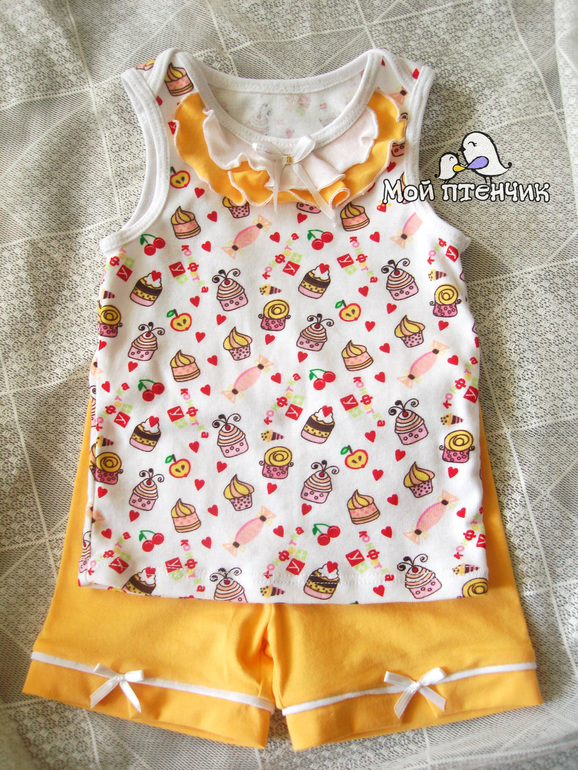 Комплектик из маечки, футболочки и шортиков для малышки на 80 размер.