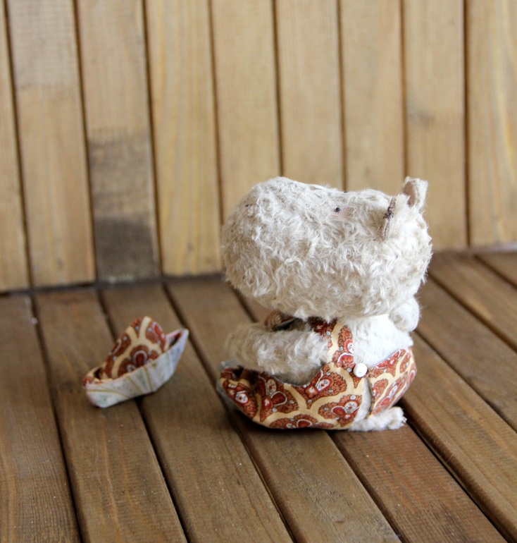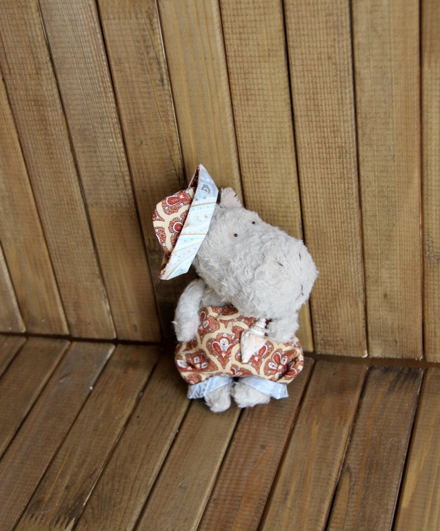 Тедди: мишки и их друзья.Маленький бегемотик дошился сегодня. Немножко его состарила, чуть подштопала кое-где) Тонировала маслицем, нарядила в панаму-кораблик и штаны с манжетами. Штанишки снимаются, они на пуговке.