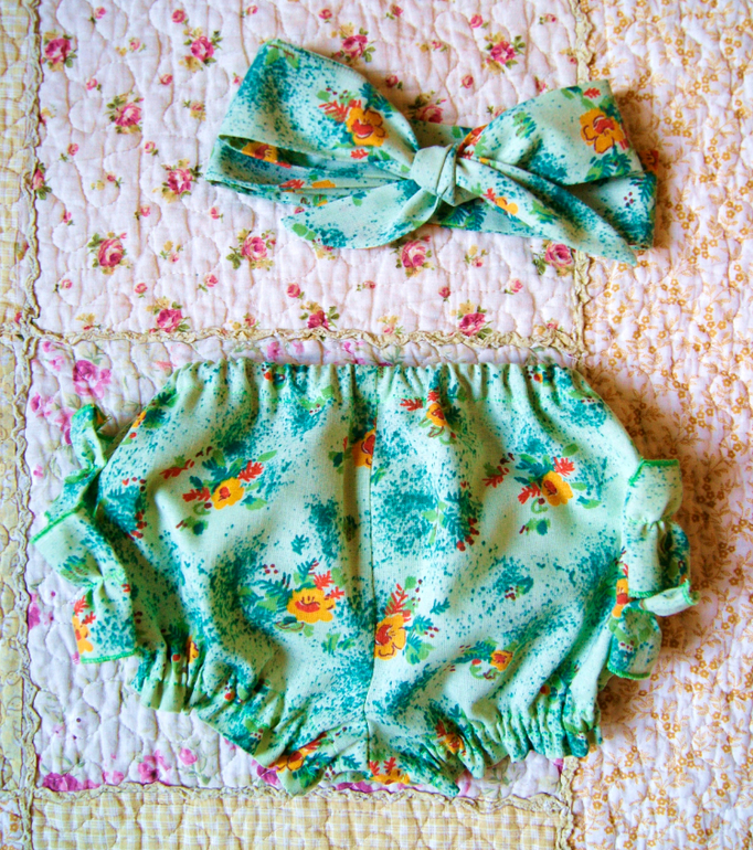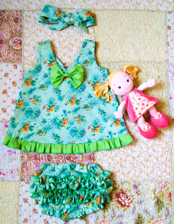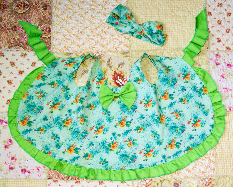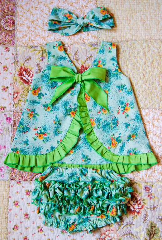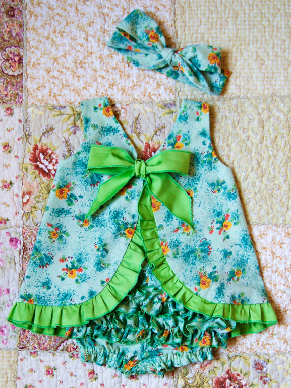 Летний комплект для малышки Яночки состоит из сарафанчика-фартучка, блумеров и повязочки -"Солоха". Сарафанчик украшен по нижнему краю оборочкой из однотонной ткани и завязывается на спинке в милый бант, на полочке дублируется бант из ткани-компаньона. Блумеры (трусики) имеют двойную оборочку сзади, проймы для ножек сосборены на резиночку, вставленную в кулиску. Талия на резиночке. В комплекте повязочка на волосы "Солоха" (завязывается в бант). Выкройку блумеров брала из выпуска "Детская мода", 2014, выкройка №620. Для сарафанчика брала выкройку из Бурды 8/2014.