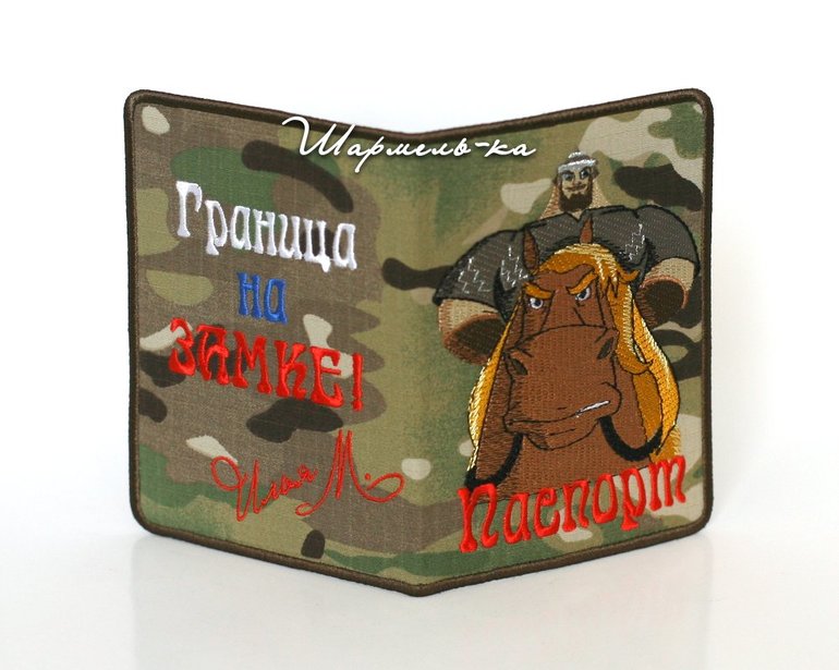 Вышивка выполнена вискозой на брутальной камуфляжной ткани polycotton. Внутри кармашки с фигурным краем из экокожи в тон верха. Обложка плотная, отлично держит форму.