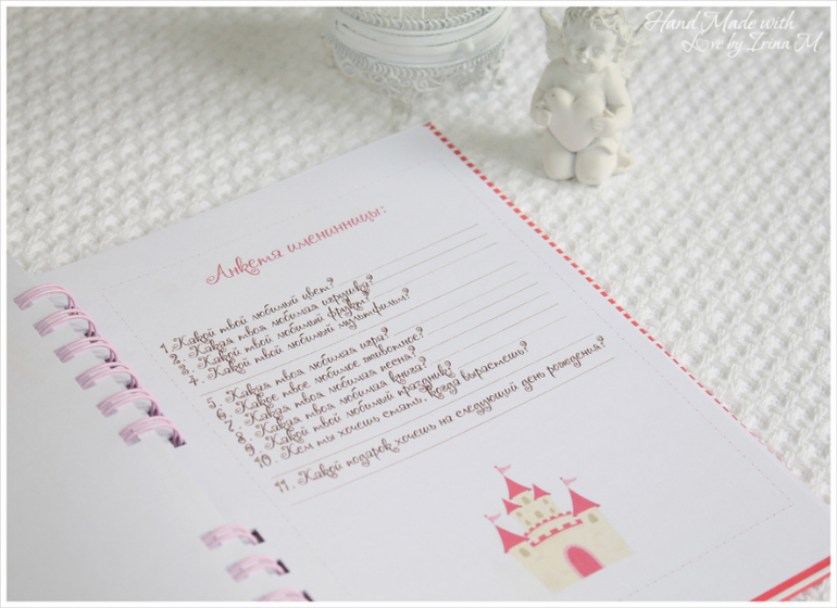 Внутри есть место для фото именинницы, место для пожеланий и анкета.