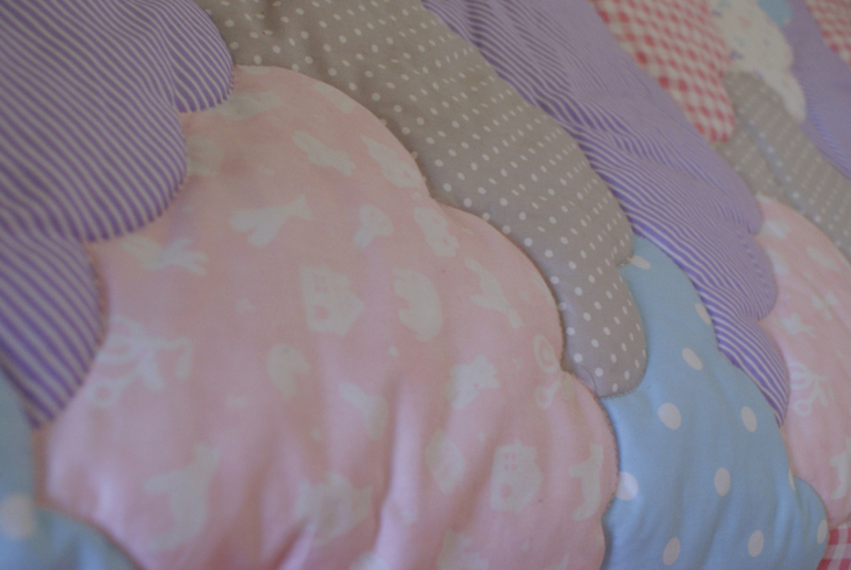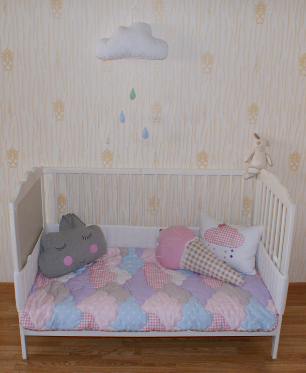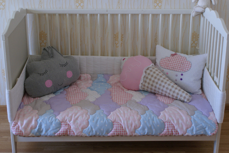 Пэчворк и квилтингВсем привет) сегодня покажу вам воздушный и нежный комплектик в детскую кроватку "Облака". Состоит он из простеженного одеялка и 3 декоративных подушек. Ну тут еще и моя юная модель засветилась))))