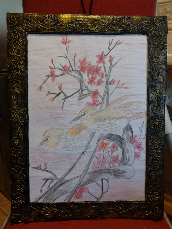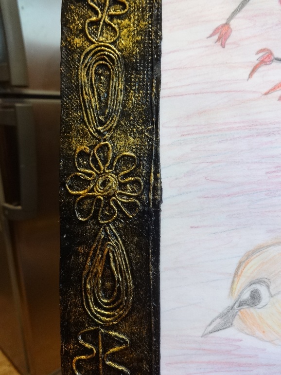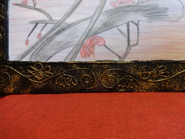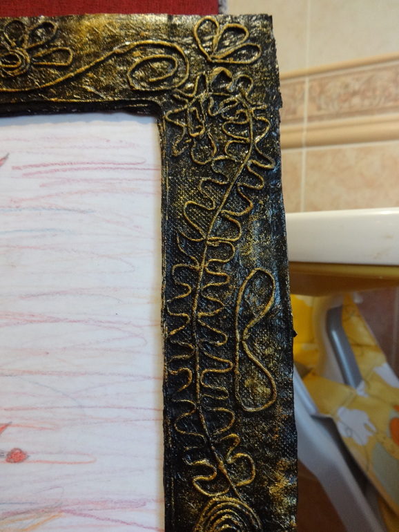 Основа рамки из плотного картона, обклеена обычными салфетками. Из салфеток же накрутила жгутики-нити, на клей ПВА клеила эти нити, выкладывая узор, потом снова ПВА покрыла уже готовый узорчик. Когда клей высох, покрыла всю рамку черной акриловой краской. Потом, когда краска высохла, с помощью губки сверху наносила золотую краску, потом сверху все покрыла акриловым лаком. Вот как-то так. МК примерный по этой технике брала здесь Мастер-класс