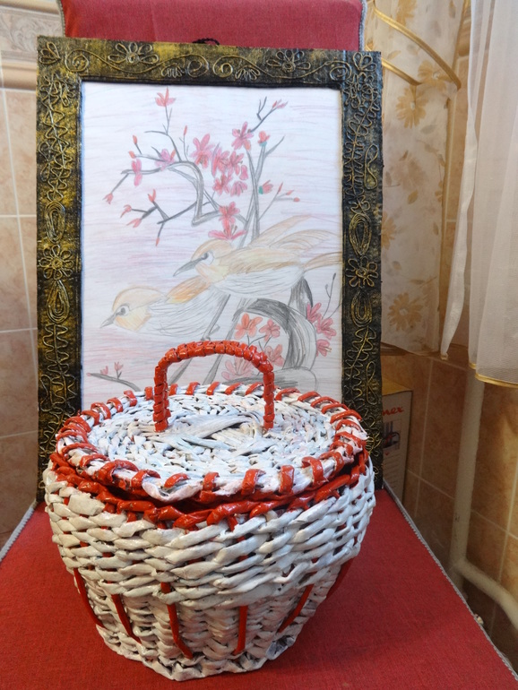 Изделия из бумаги, папье-маше, квиллинг.В тандеме с любимым сыном "натворили" подарки маме и, соответственно, бабушке на День рождения. Еще не дарили, завтра повезем. Шкатулочка сплетена из газетных трубочек, сразу скажу, это мое второе по счету изделие, поэтому не совсем красивое. Не получилось опять форму ровную ему придать, ну, наверное, попрактиковаться надо по-больше. Рамочку для рисунка сына сделала из бумаги, украсила в технике пейп-арт, автор техники Татьяна Сорокина. Под срезом много фото.