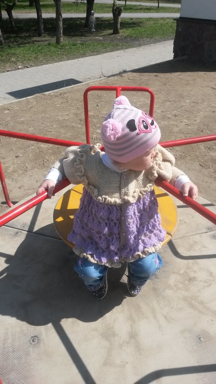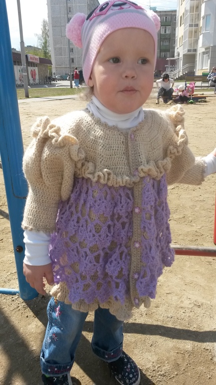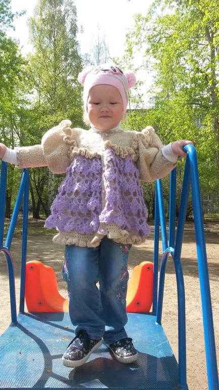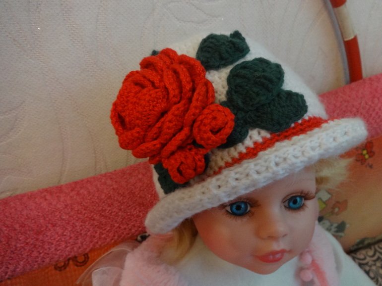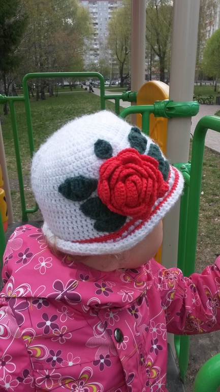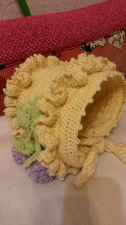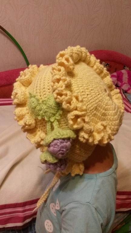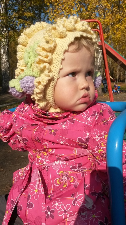 Шапочка-чепчик, вязалась под вышепоказанное пальто, но вместе с ним смотрится "слишком" (перебор с рюшечками), поэтому носим раздельно.