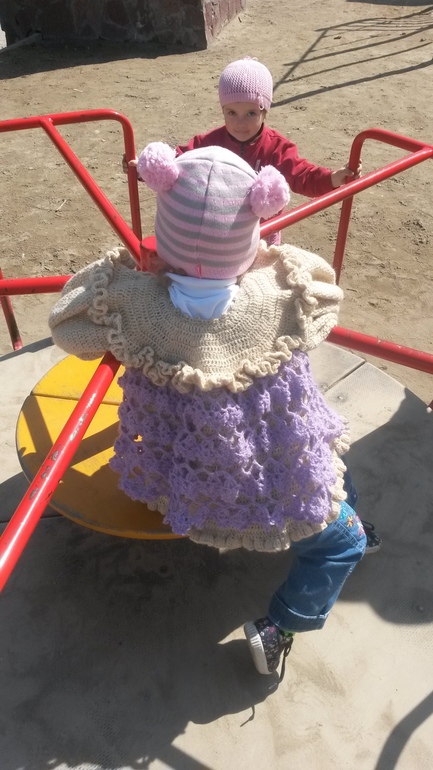 Пальто шерстяное, связано без швов, в основе - круглая кокетка. Наконец-то установилась у нас теплая погода, так что на днях пальтишко "выгуляли". Дальше много фото.