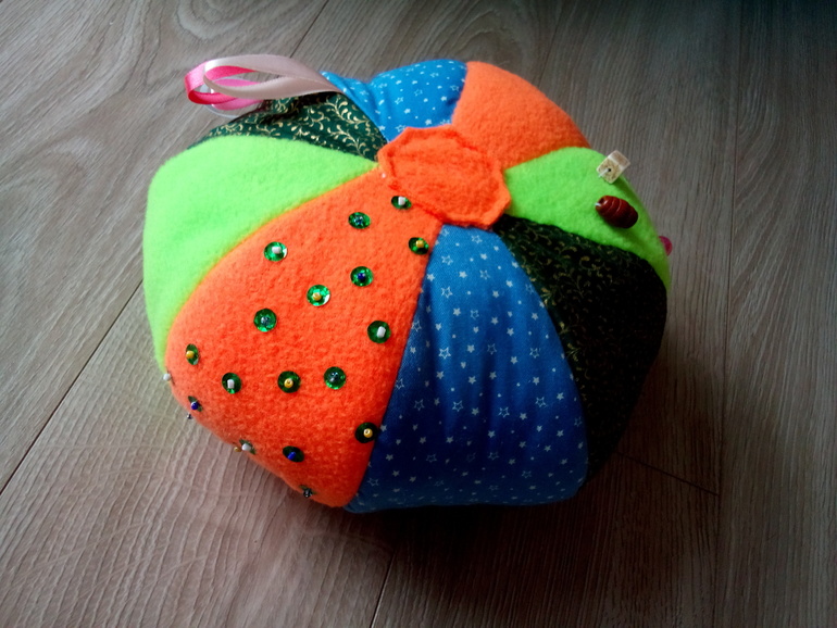 только вместо 6 долек, я 8 вырезала))) и вместо мячика у меня получилась тыквочка))) все дольки сшили, оставив небольшое отверстие для заполнения синтепоном и нашивки паеток с бусинами)))) в итоге получилась вот что: