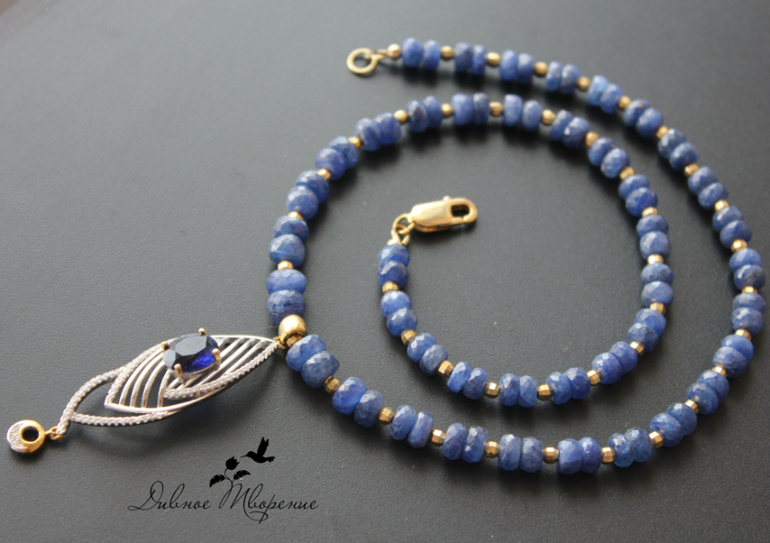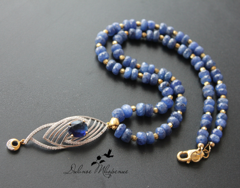 Колье из светлого и позолоченного серебра 925 пробы и синего, природного сапфира.
